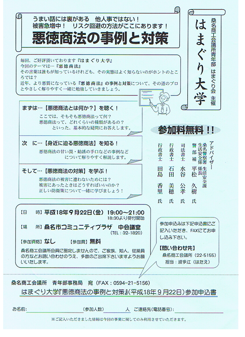 9月22日(金)19:00~21:00(18:30より受付開始)に、桑名市コミュニティプラザ中会議室にて、桑名商工会議所青年部主催のはまぐり大学で、「悪徳商法の事例と対策」をテーマにした講演会がある