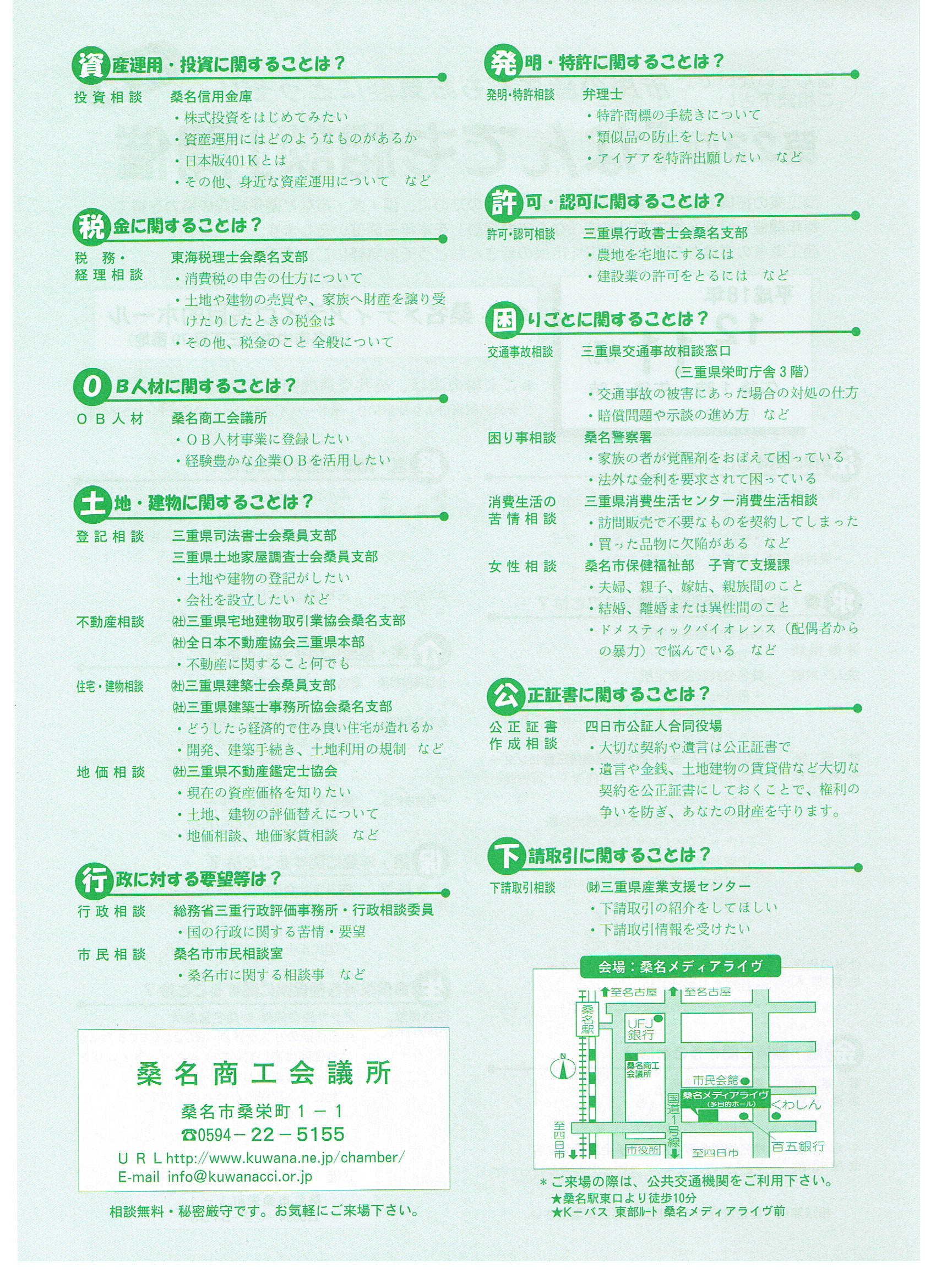 弁護士、司法書士、土地家屋調査士、中小企業診断士、弁理士、税理士、不動産鑑定士といった士業による相談や、労働基準監督署、社会保険事務所、公共職業安定所、三重県産業支援室、桑名保健福祉事務所、桑名市介護高齢福祉課、公証人役場といった役所関係による相談、その他金融機関や生命保険、宅地建物に関する相談など、文字通り「なんでも相談」だ