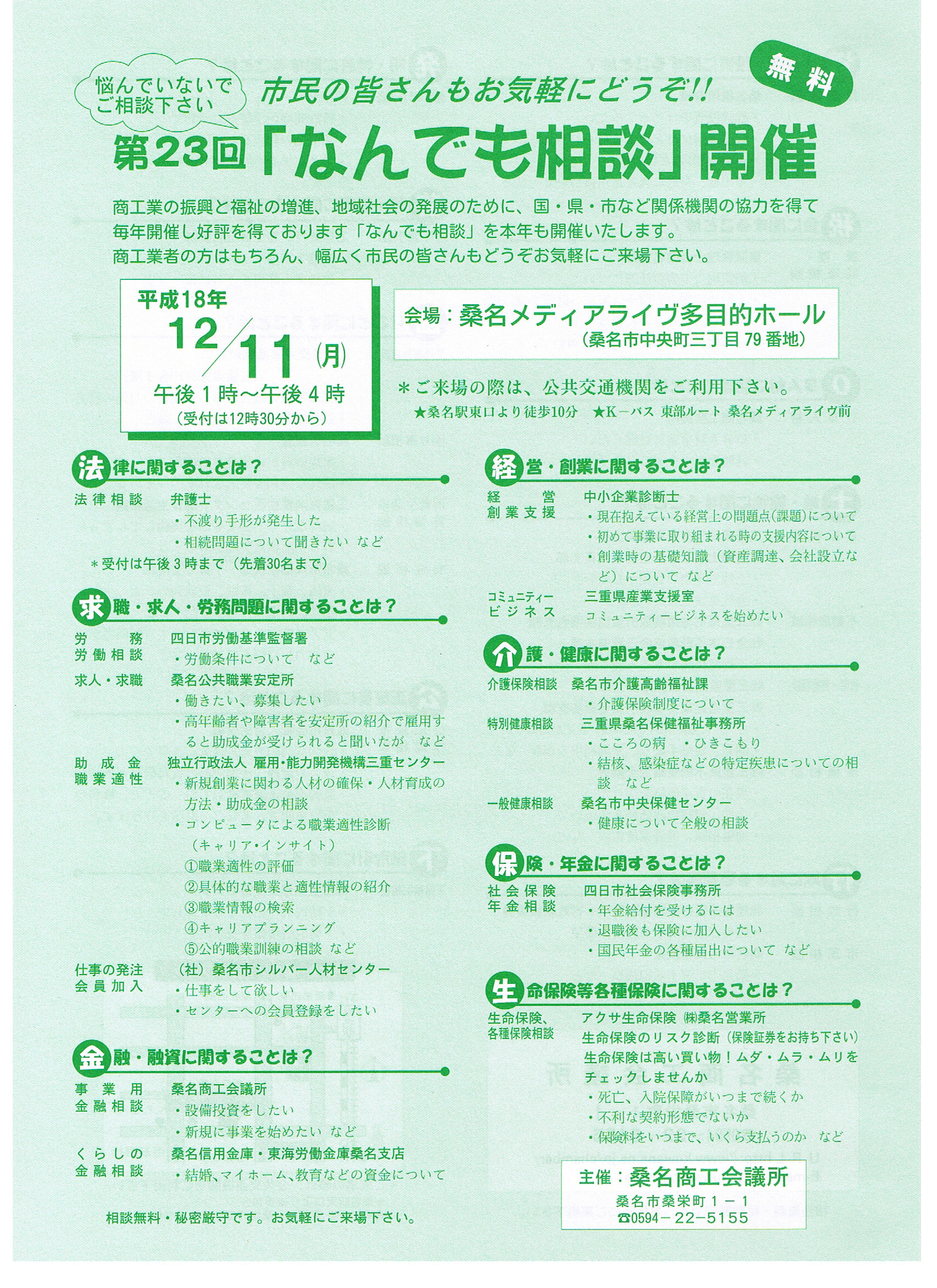 12月11日(月)に毎年恒例の桑名商工会議所主催「なんでも相談」がある。