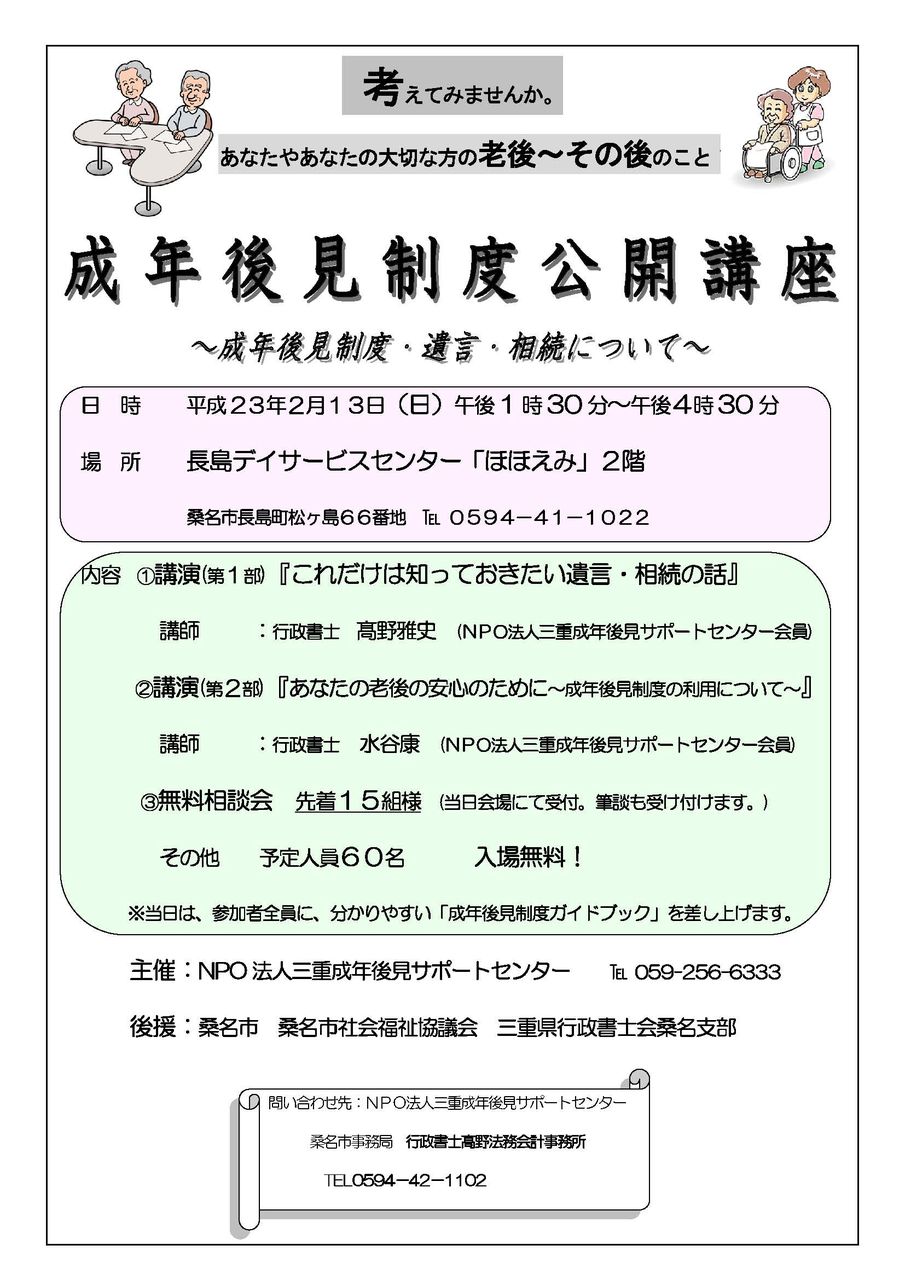 平成23年2月13日(日)にNPO法人三重成年後見サポートセンター主催(後援:桑名市、桑名市社会福祉協議会、三重県行政書士会桑名支部)で「成年後見制度公開講座~成年後見制度・遺言・相続について~」が開催されます。