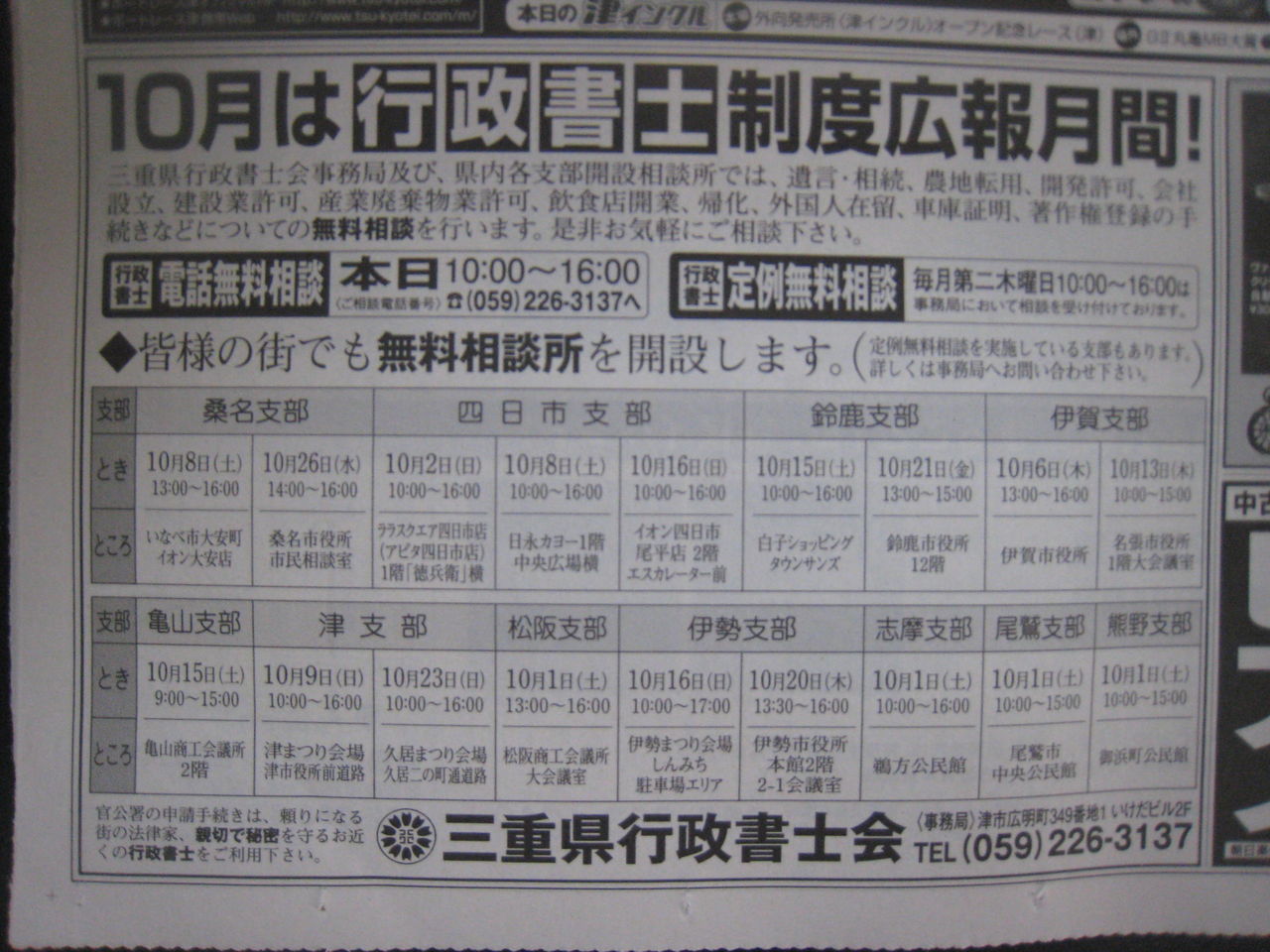 三重県行政書士会では、本日10時から16時まで行政書士電話無料相談を行っております。059-226-3137(三重県行政書士会)