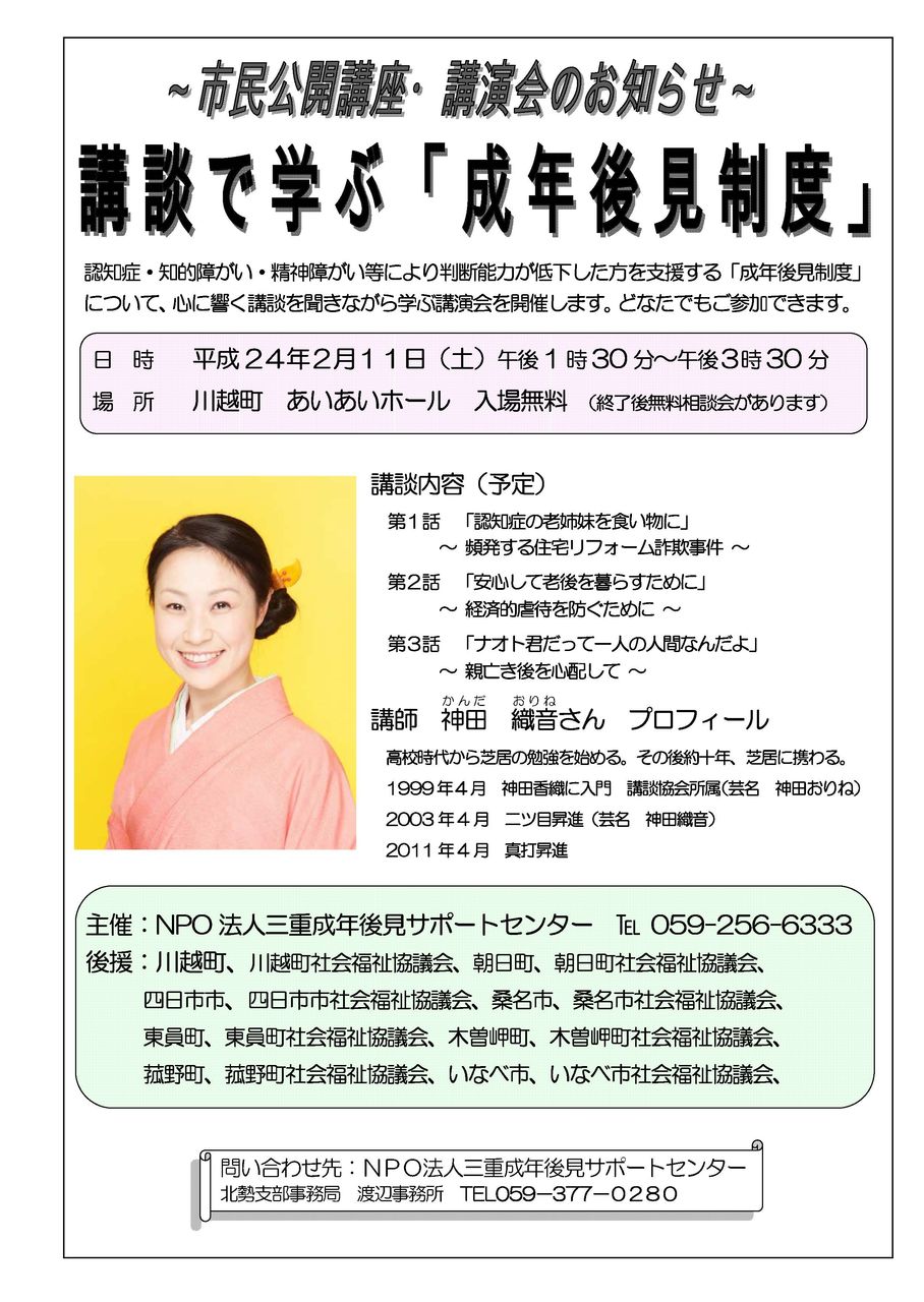 NPO法人三重成年後見サポートセンター主催で、講談で学ぶ「成年後見制度」が、開催されます。